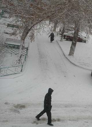 Снег кружИтся над лужами грязными.