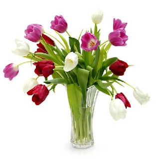 В руках - тюльпановый букет.