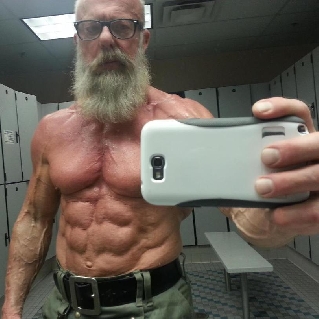 Глаза усталые, седая голова.